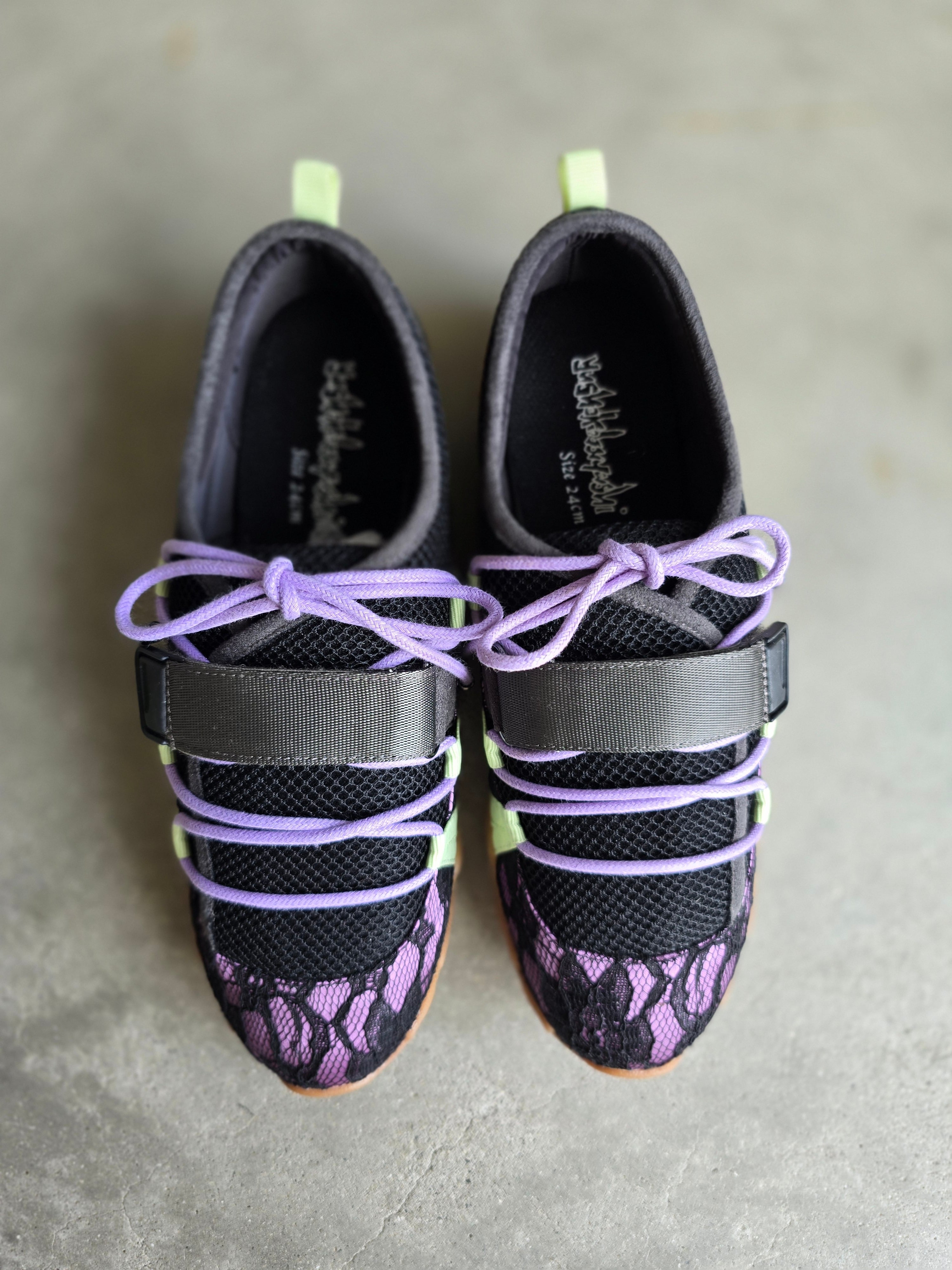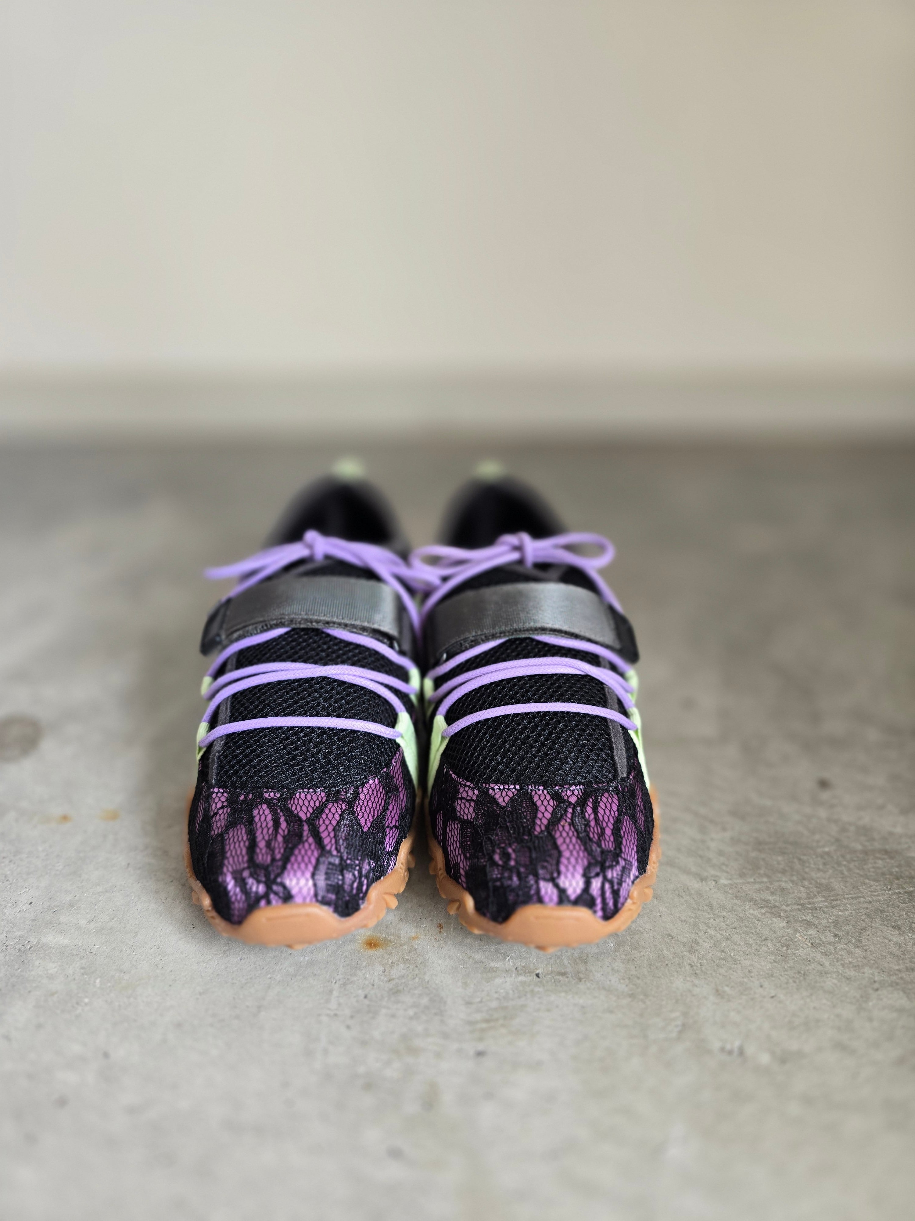 パープルのサテン生地の上に黒のレースを重ねたスニーカー。