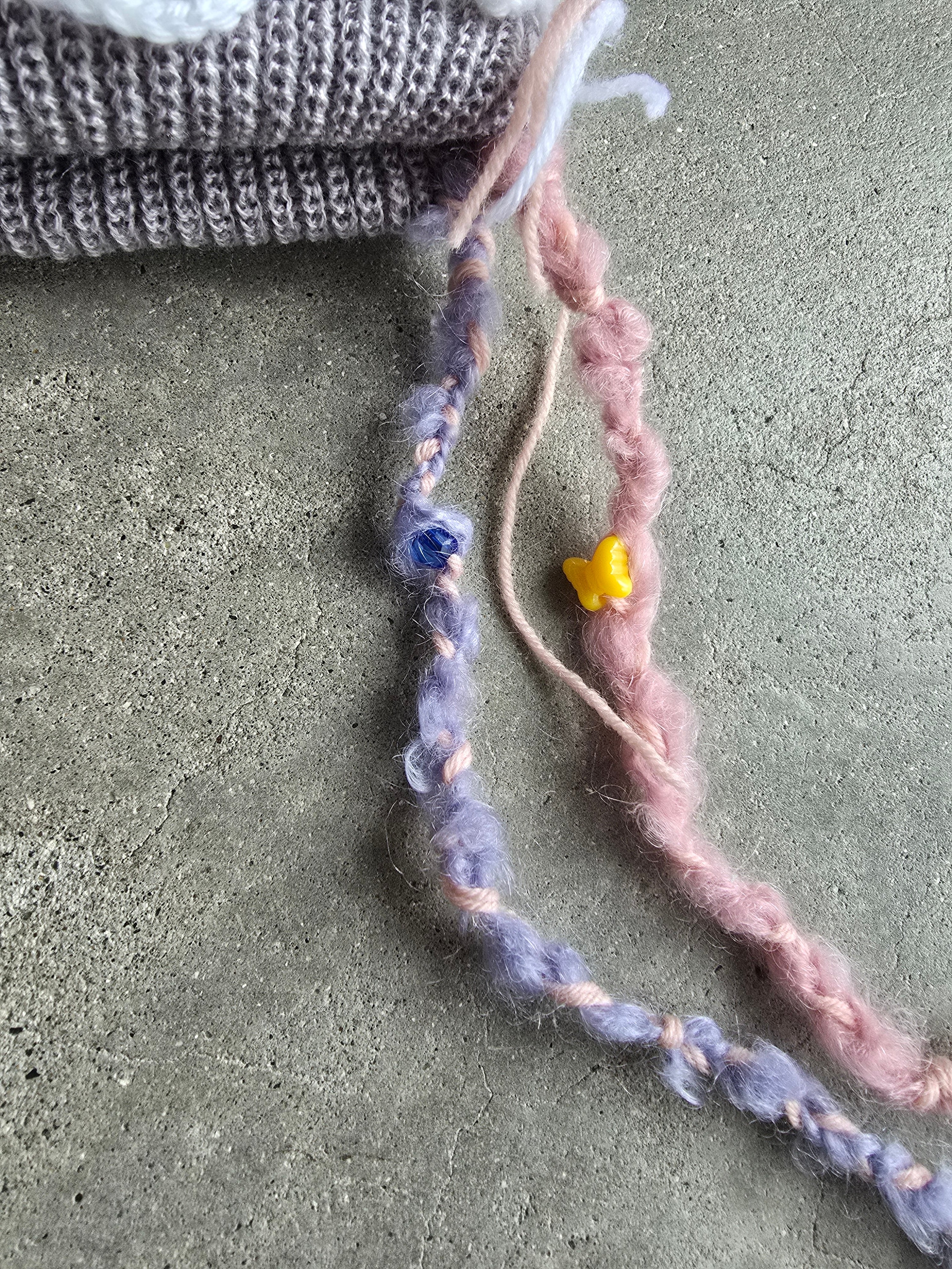 両サイドから垂れてる長いひもは、蝶々などのカラフルなビーズも一緒に編まれていてアクセサリーのようでかわいらしい。