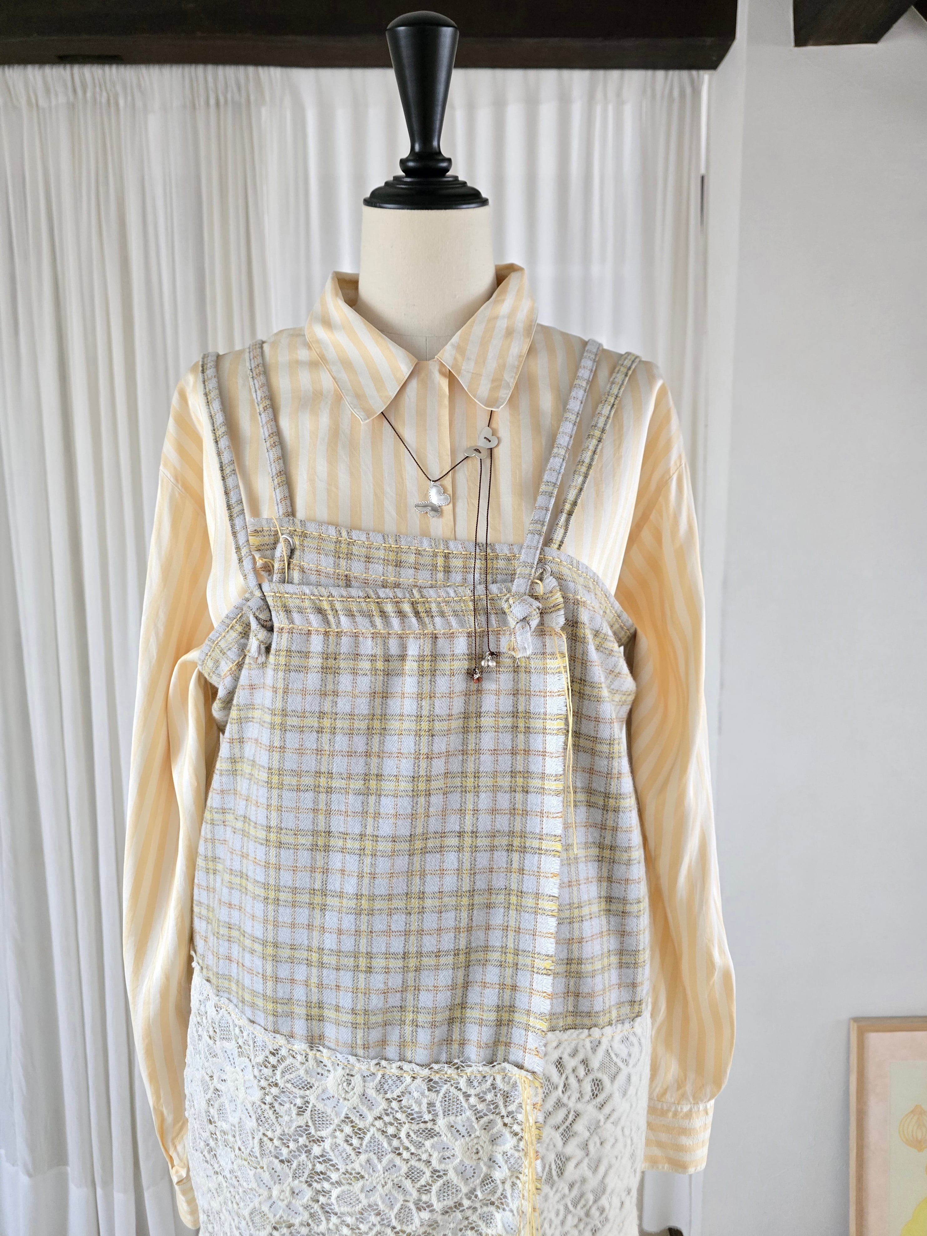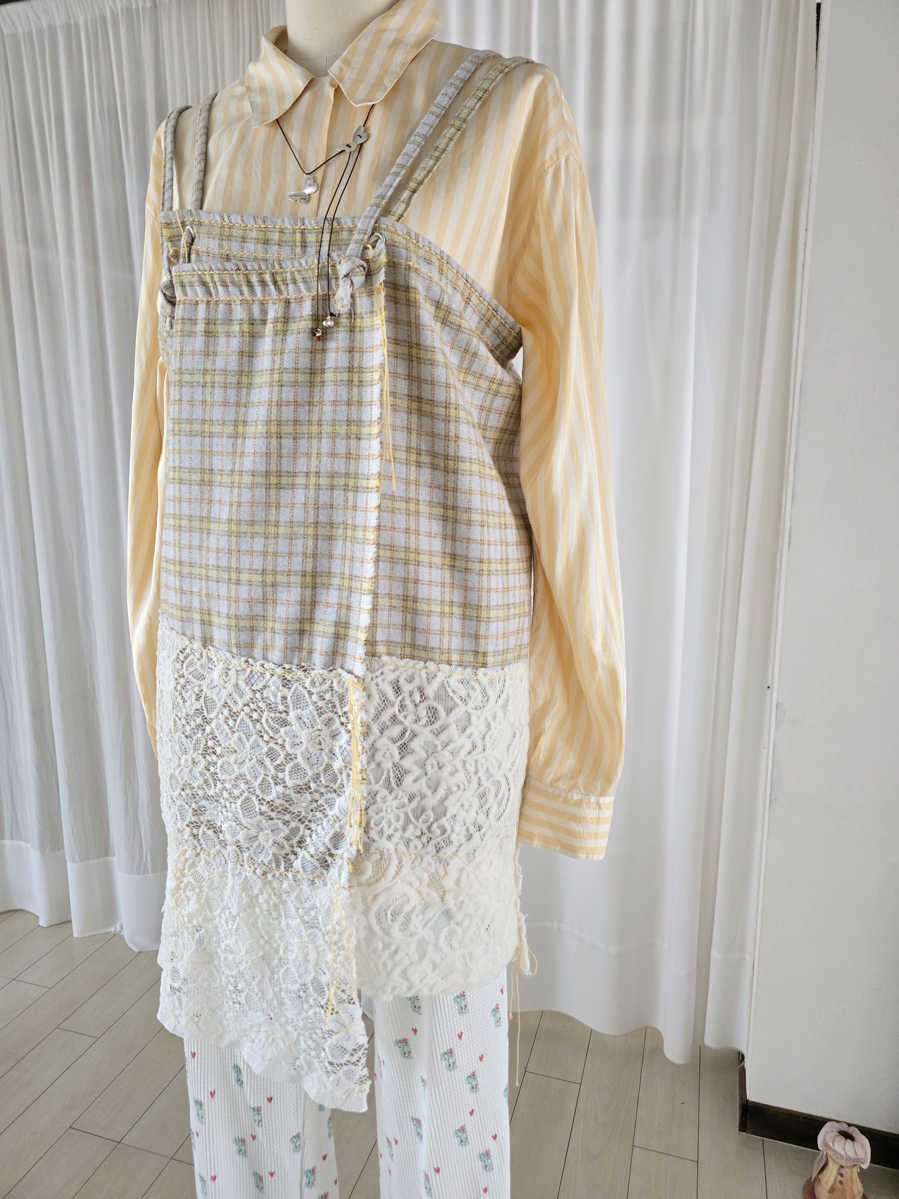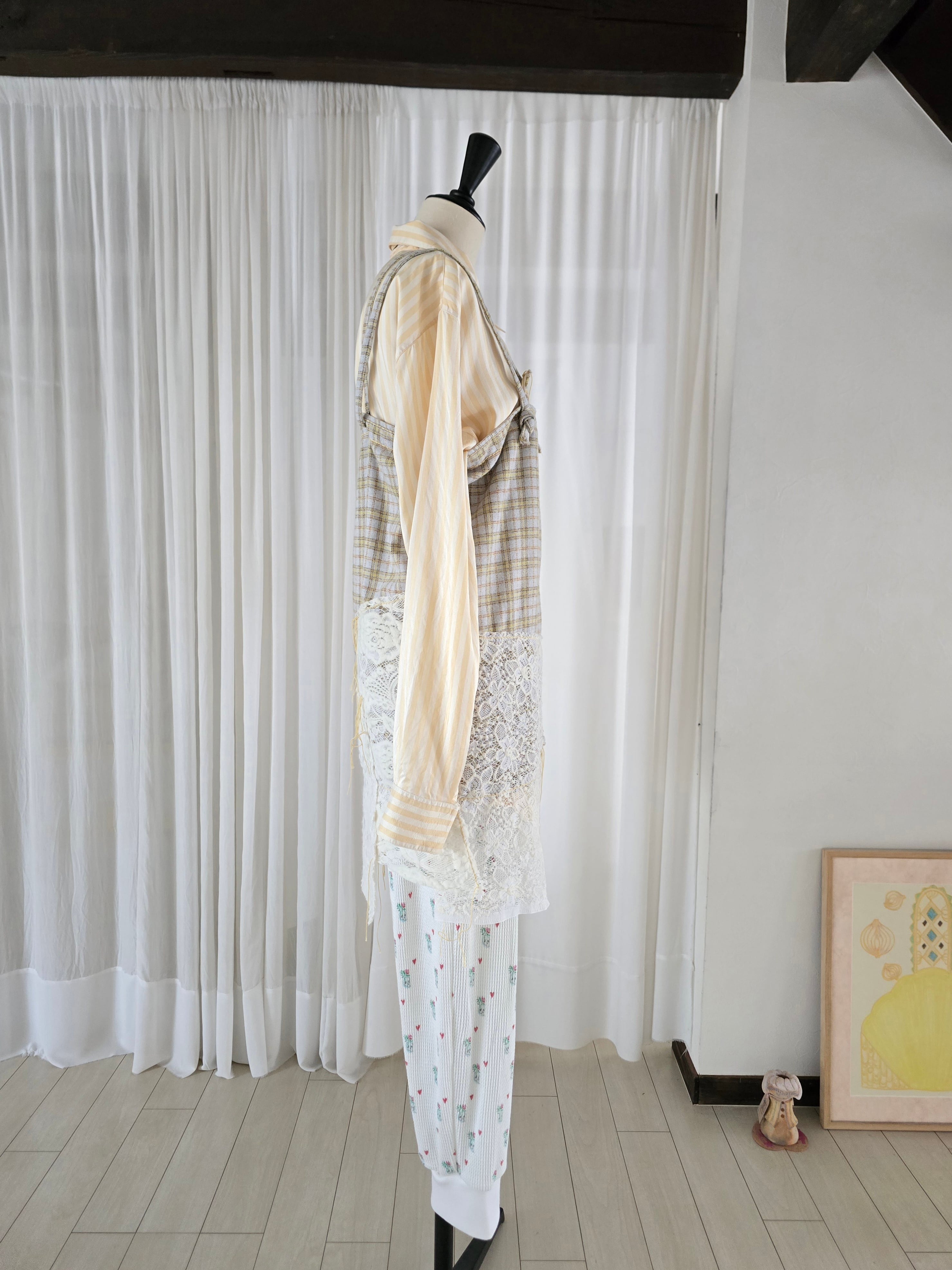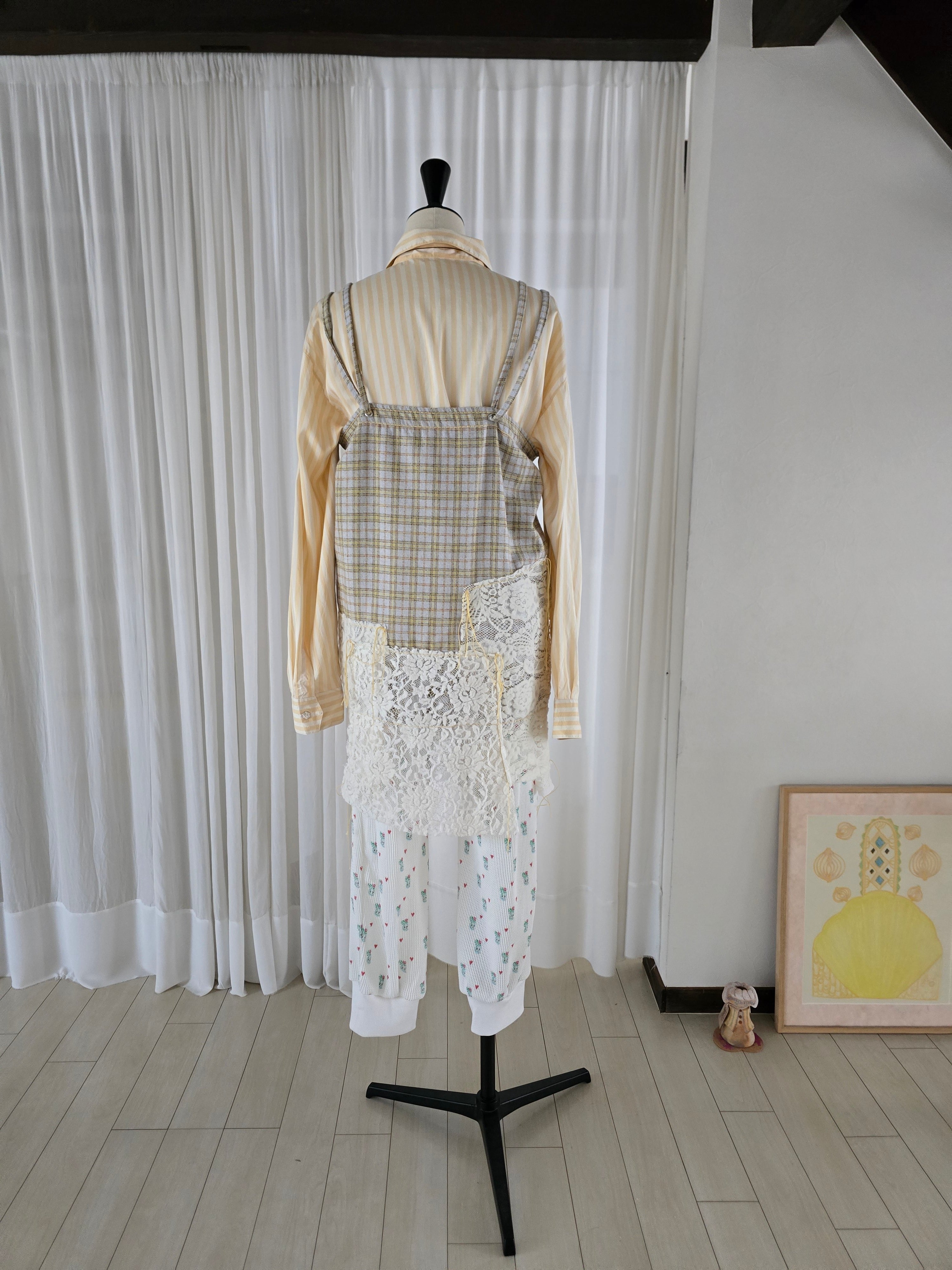 モコモコのレースとプレーンレースのパッチワークを施したキャミソールショートドレス。
