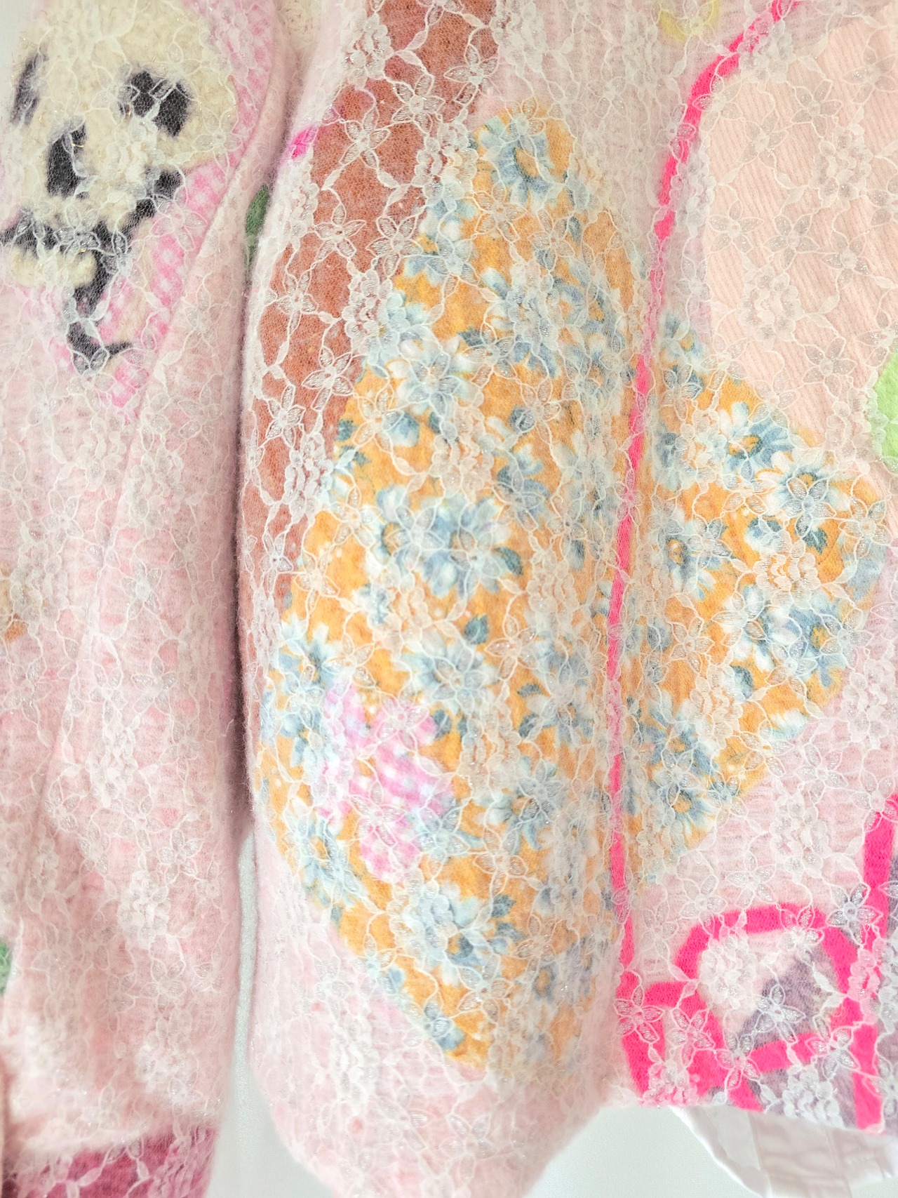 手編みのニットモチーフのドクロやお花などを閉じ込めたニードルパンチのオリジナル生地で出来たジャケットです。