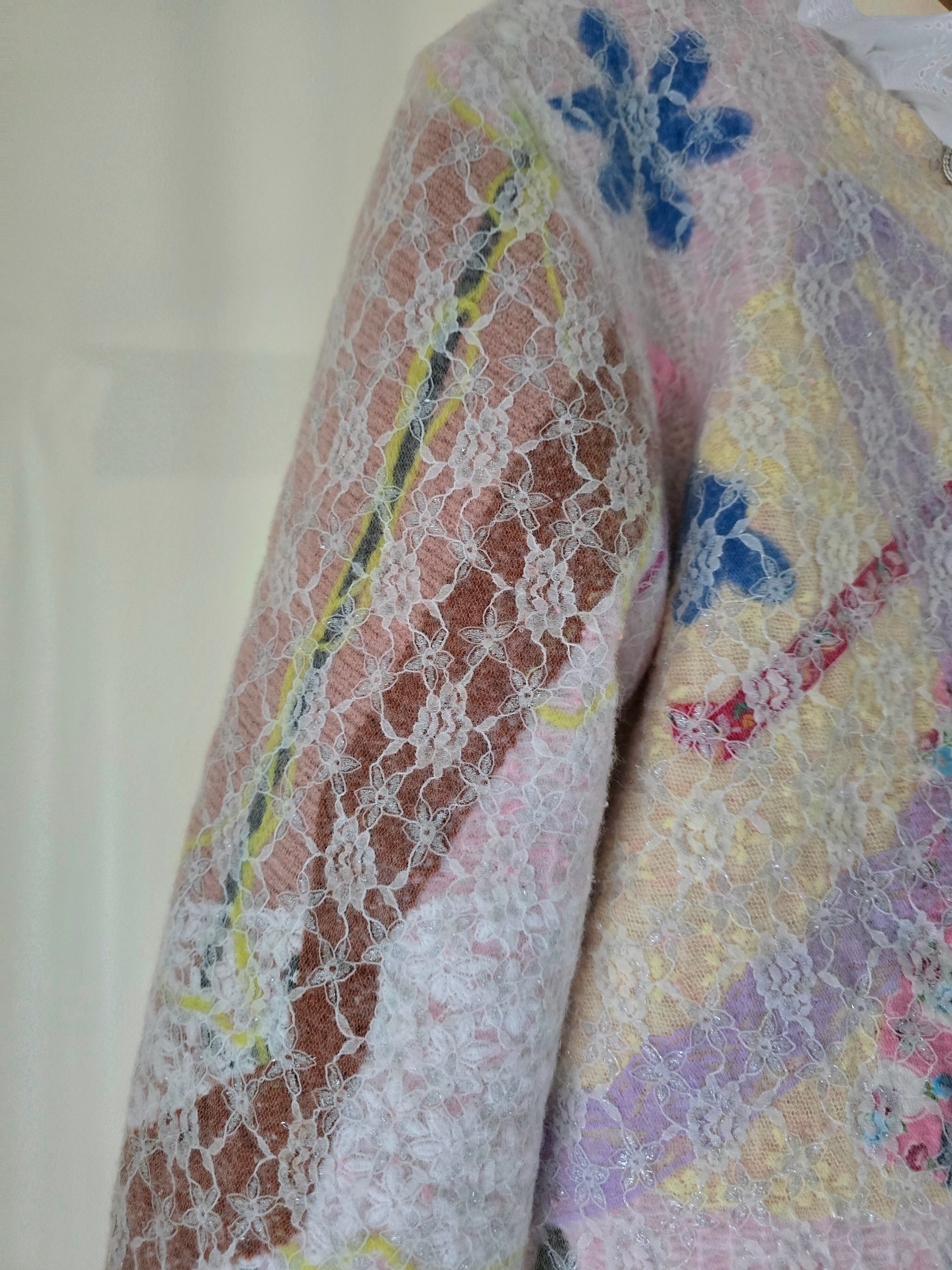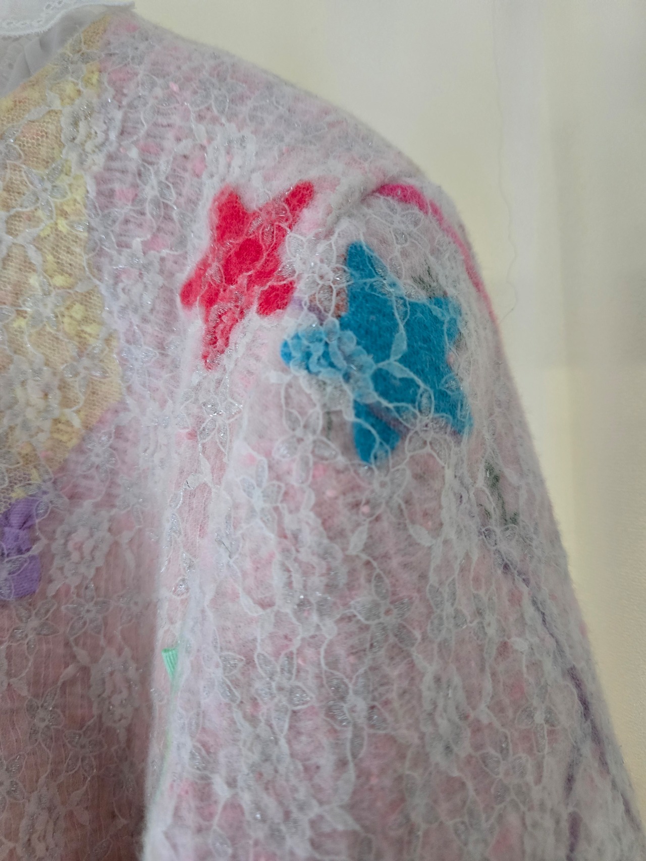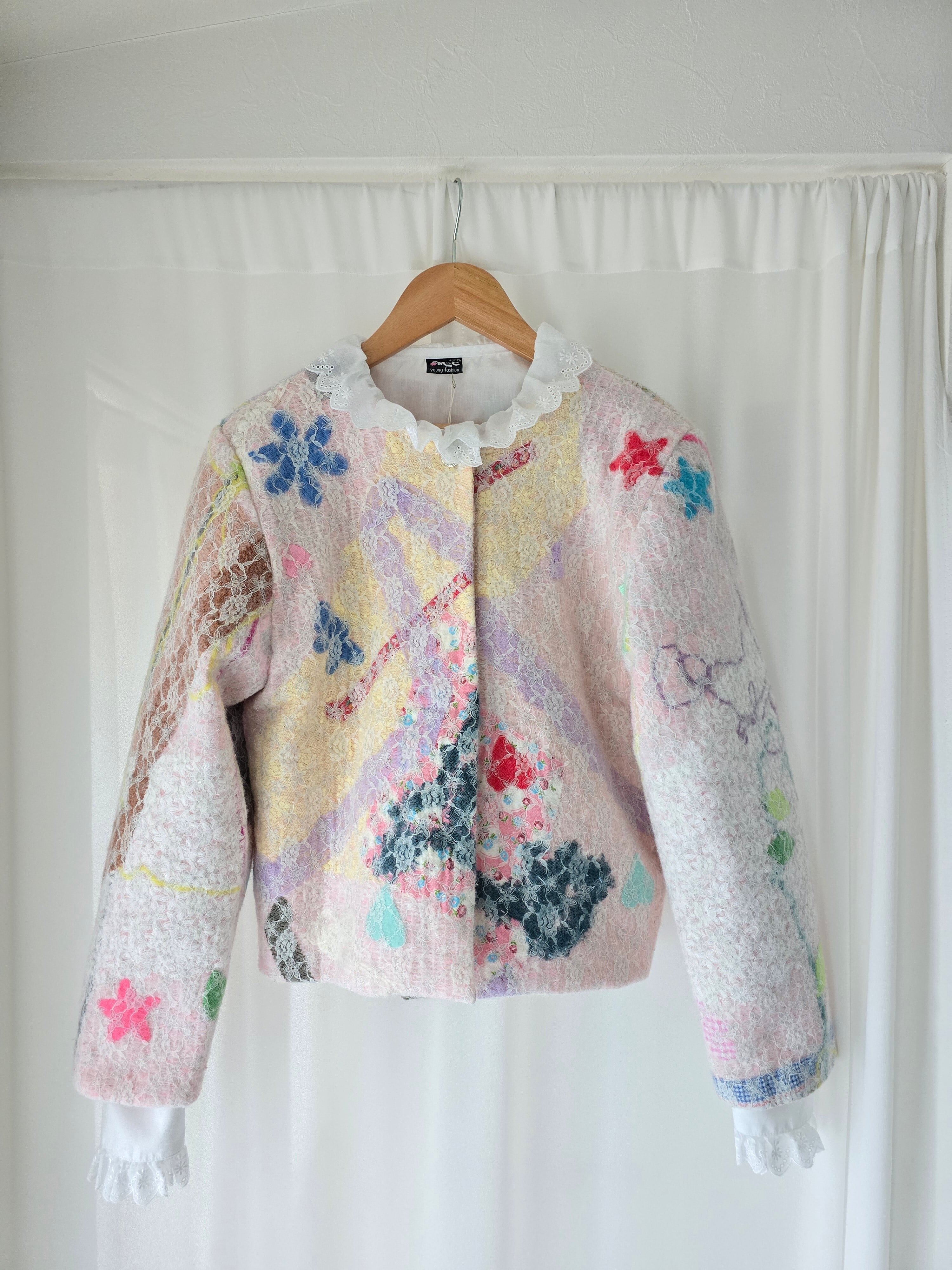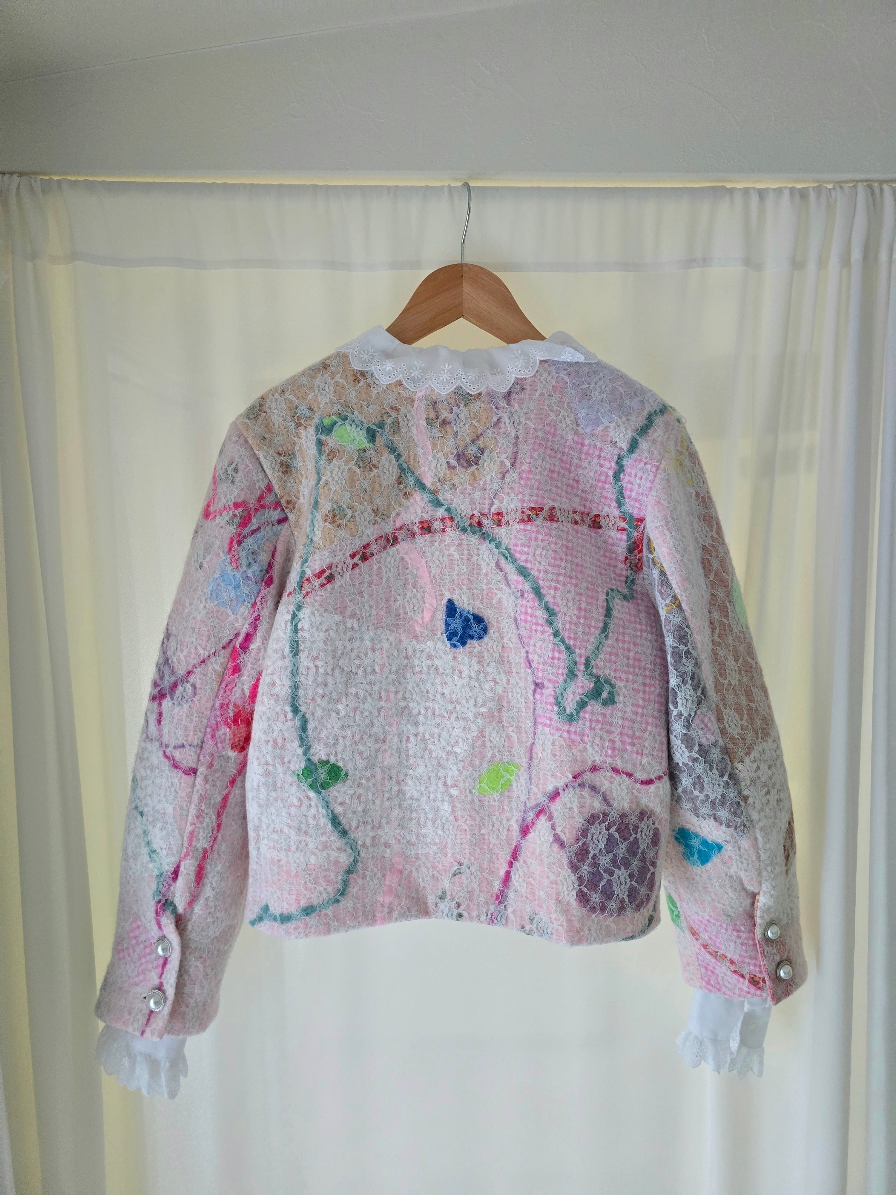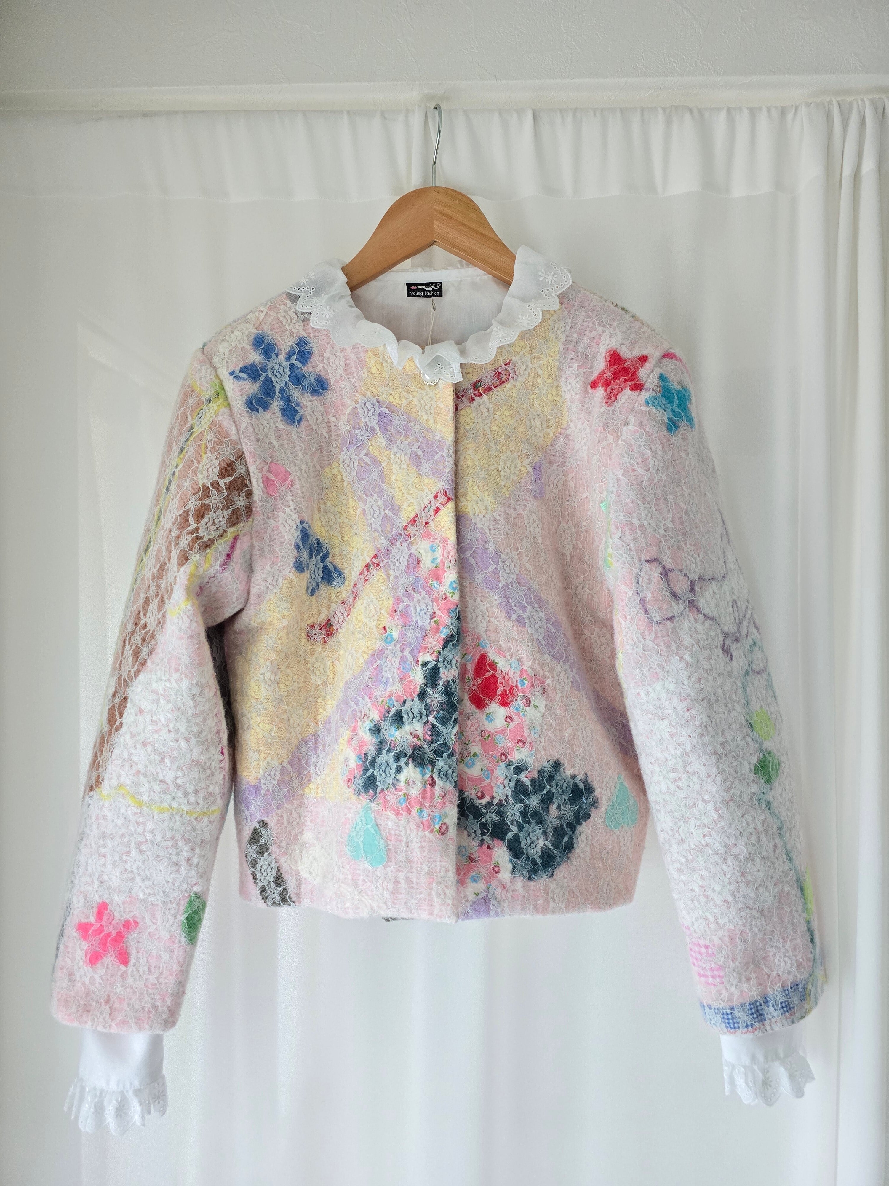 手編みのニットモチーフやお花などを閉じ込めたニードルパンチのオリジナル生地で出来たジャケットです。