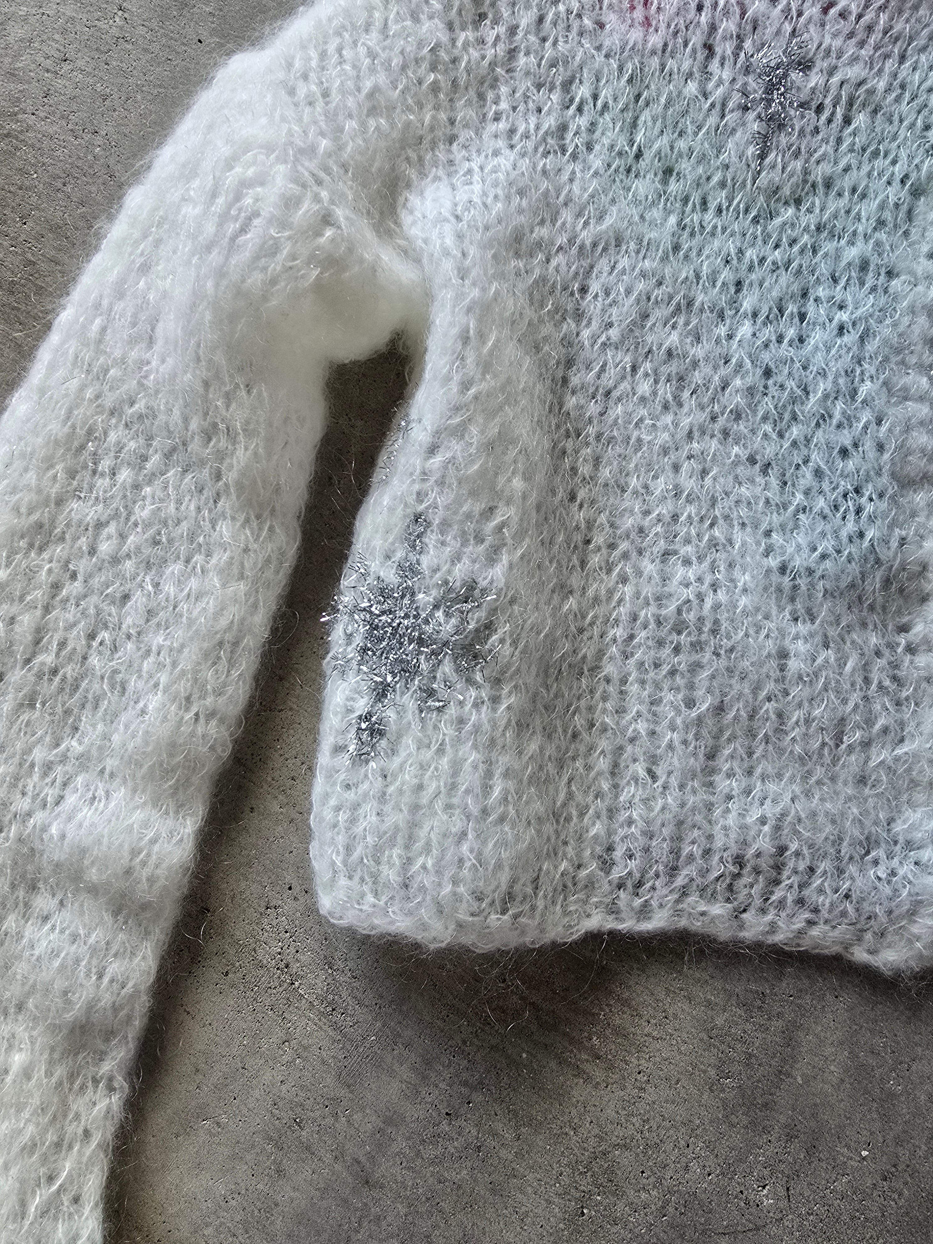 ベース部分の白いニットには、ところどころシルバーの糸が混じっていて、