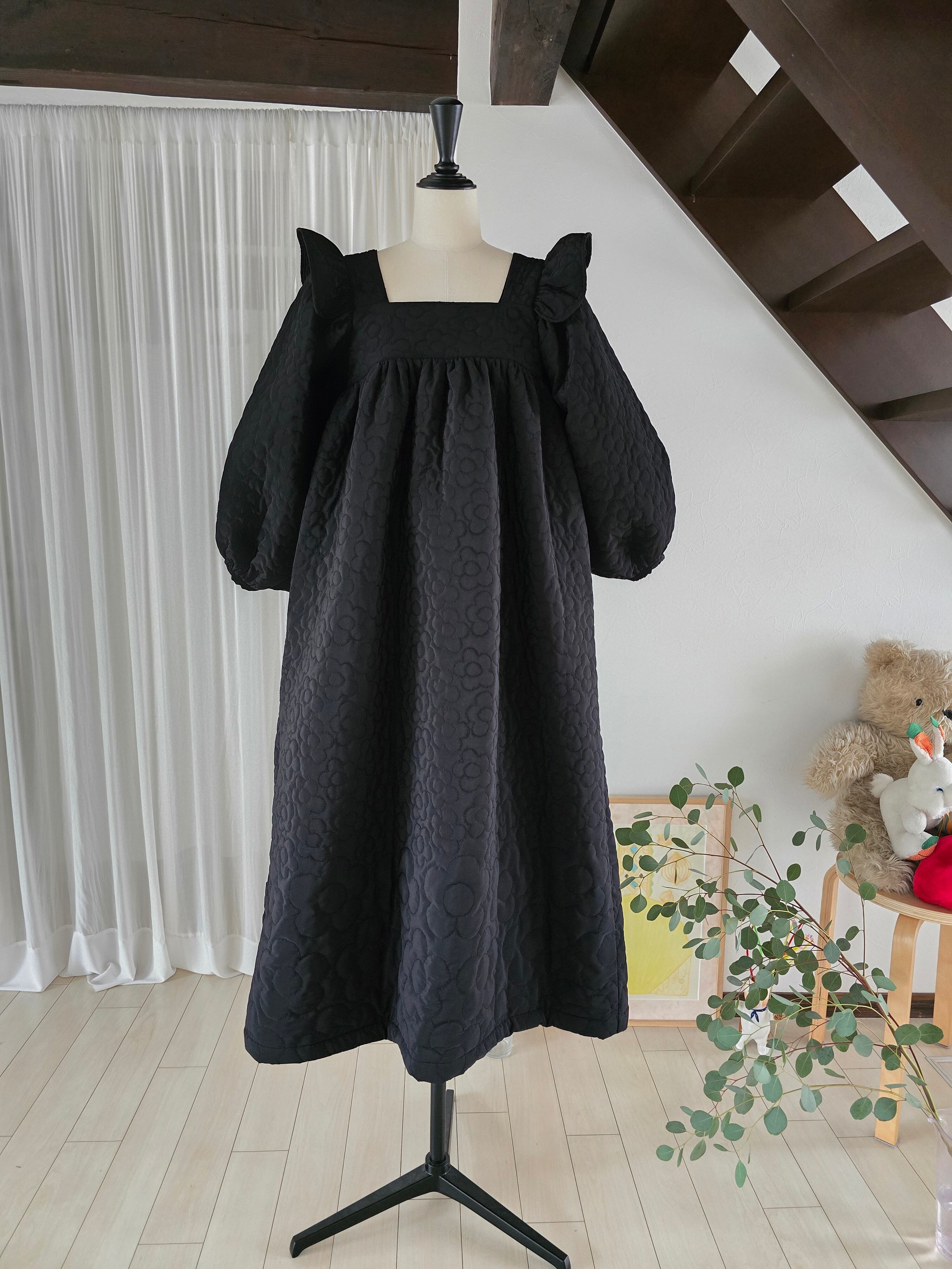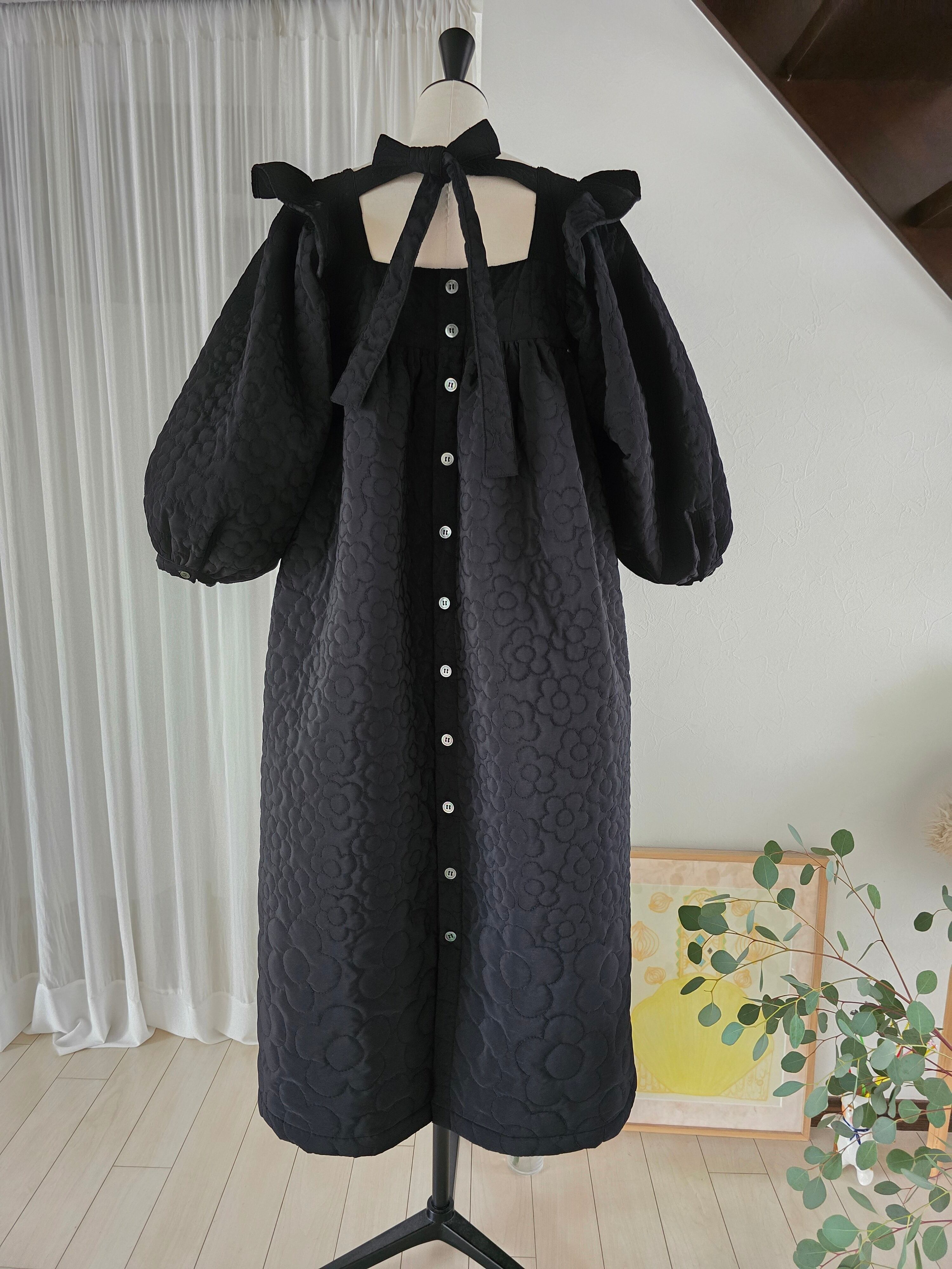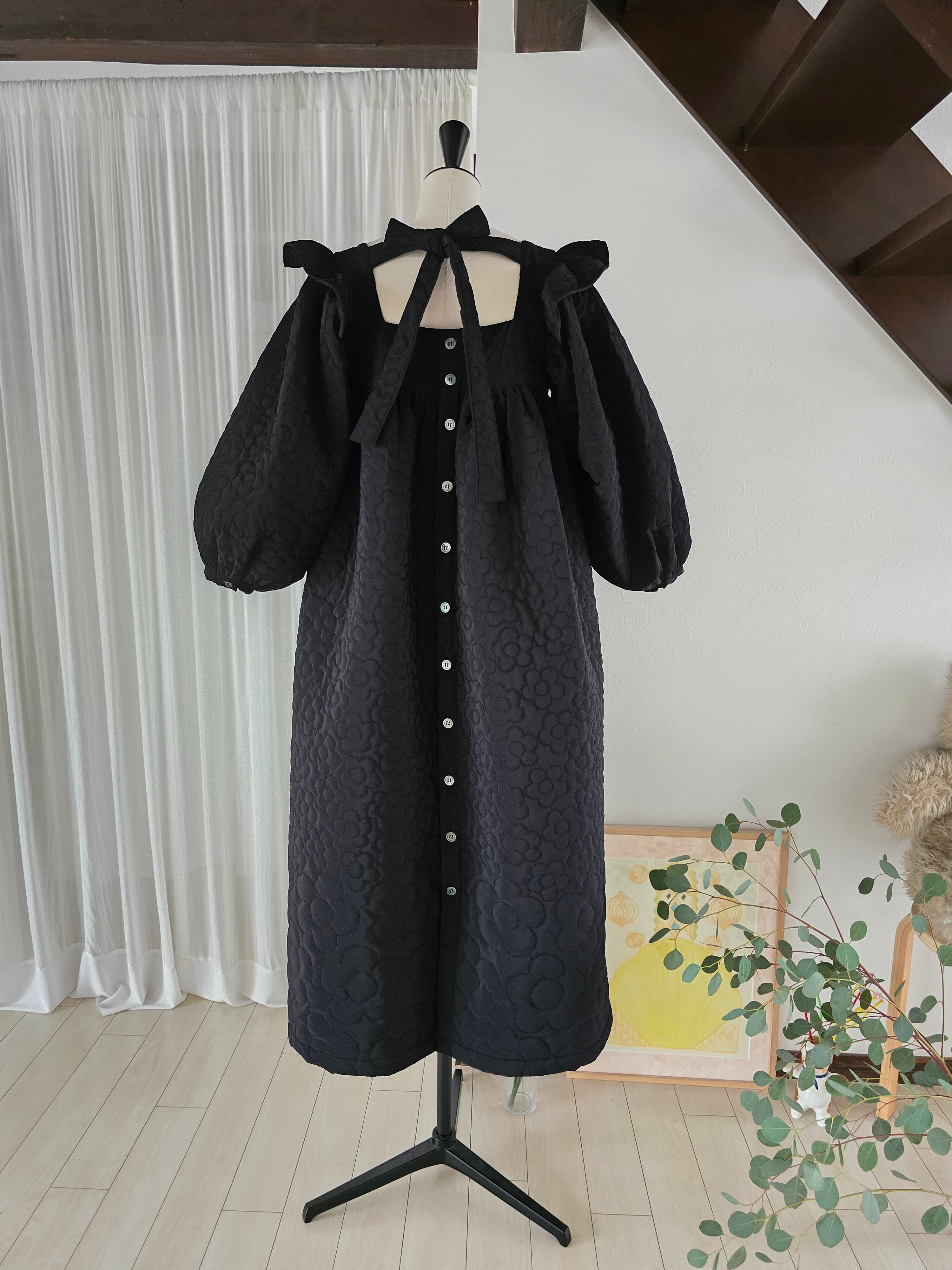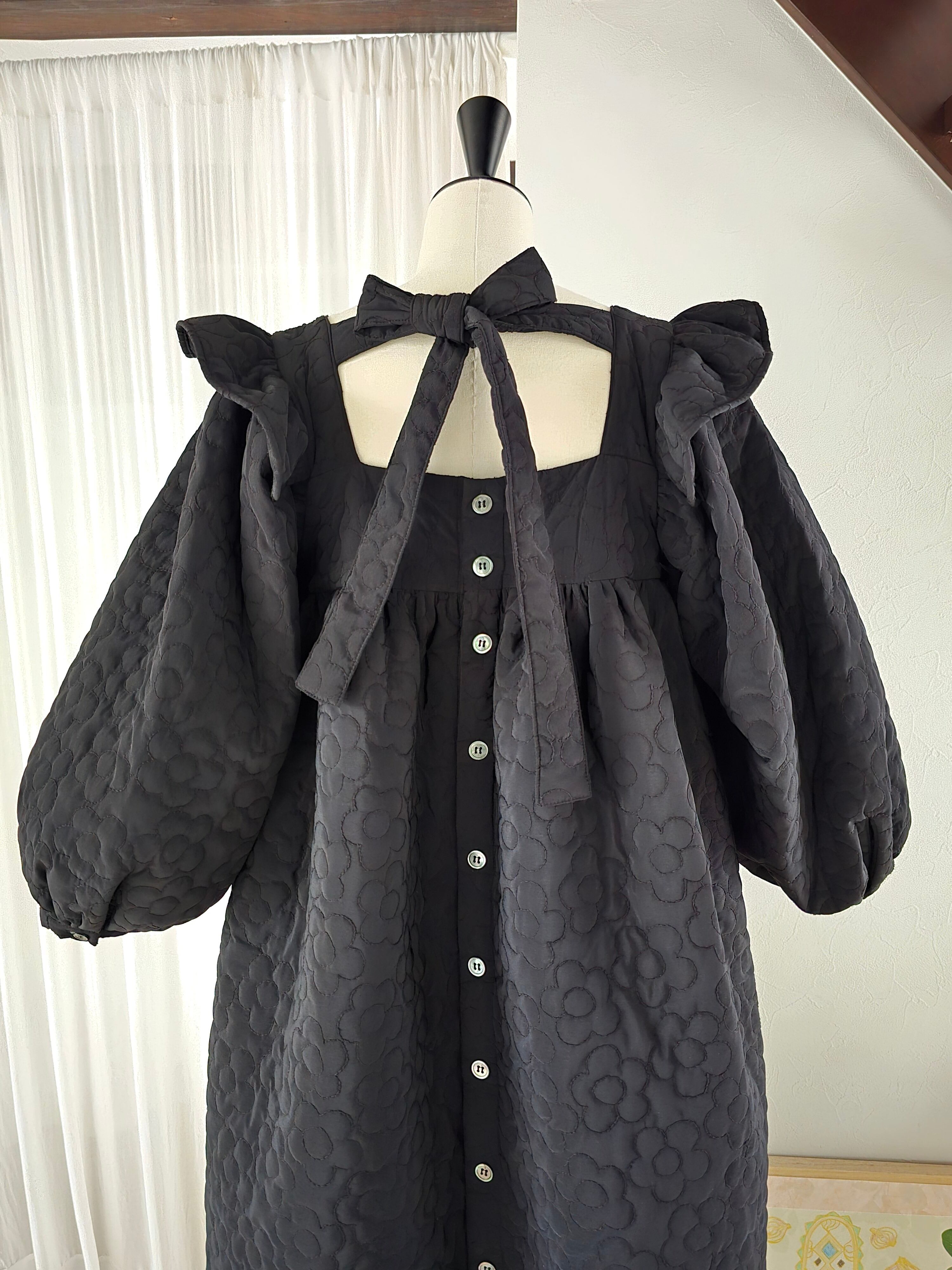 naoki tomizuka オリジナルの大小お花のキルティング生地の後ろ開きドレス。